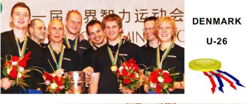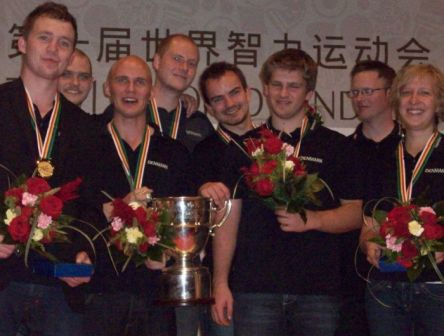 De 6 danske guldvindere: Dennis Bilde 18 år, Emil Jensen 19 år, Fie Houlberg 23, Lars K. Nielsen 23, Martin Schaltz 24 og Jonas Houmøller 26. Kaptajn Kåre Gjaldbæk og coach Henrik Røn. Et ungt hold, hvor de 5 kan stille op næste år i kamp om Junior EM (aldersgrænse 25 år).