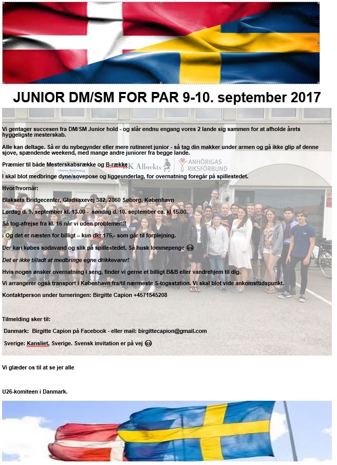 DM for juniorpar er åben for alle DBf-medlemmer indtil den sæson, man fylder 25 år. Det vil sige, at man i denne sæson skal være født d 1. januar 1993 eller senere. Der spilles i Blaksets Bridgecenter i København d. 9. og 10. september 2017, og vi glæder os til at se både gamle og nye deltagere! Der er fri tilmelding, deltagelsen er gratis for alle medlemmer af DBf, og hvis du ikke er medlem i forvejen, koster det kun 100kr, og så sørger vi for, at du bliver meldt ind i en klub.