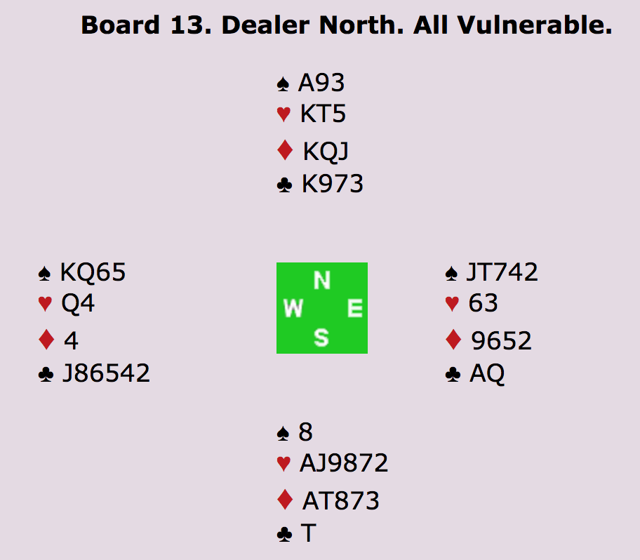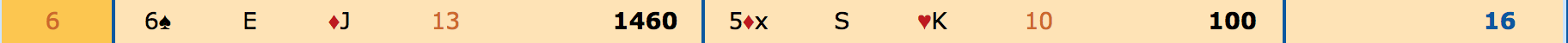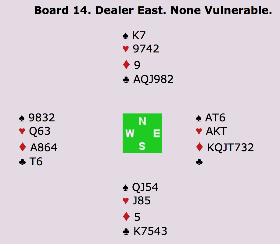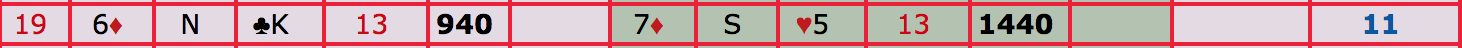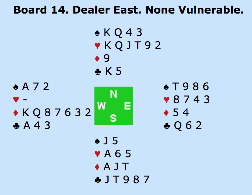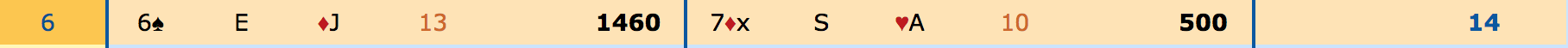 I spil 14 går meldingerne 2KL (Ø) - Pas - 2RU (relæ) - 3KL (N) - 3RU (Ø) - 4KL (S) - 4RU (V) - Pas (N) - 4HJ (Ø) - Pas (S) - 5RU (V) - Pas (N) - 6RU (Ø) - Alle Pas.