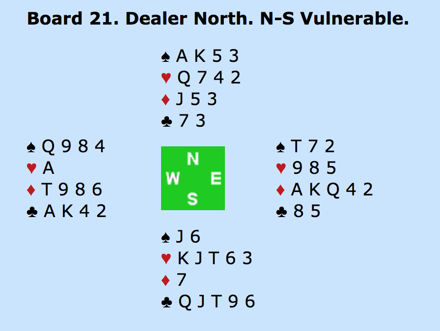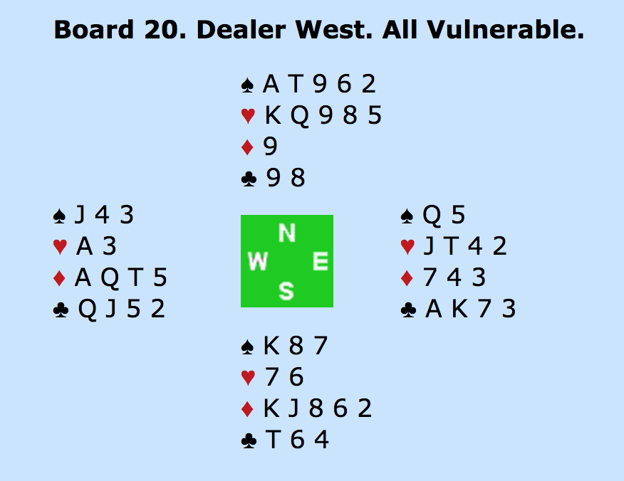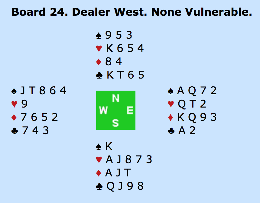 VEST (Bilde): 1KLØR. NORD (Multon) 2RUDER (begge major). ØST (Blakset) 2UT. SYD: PAS. VEST: 3UT.