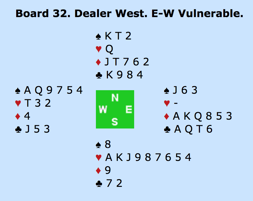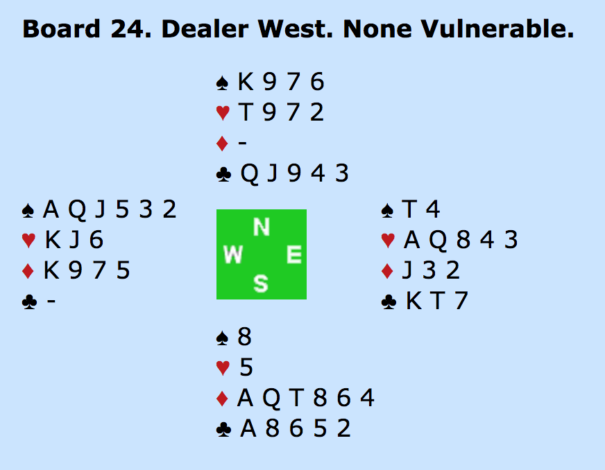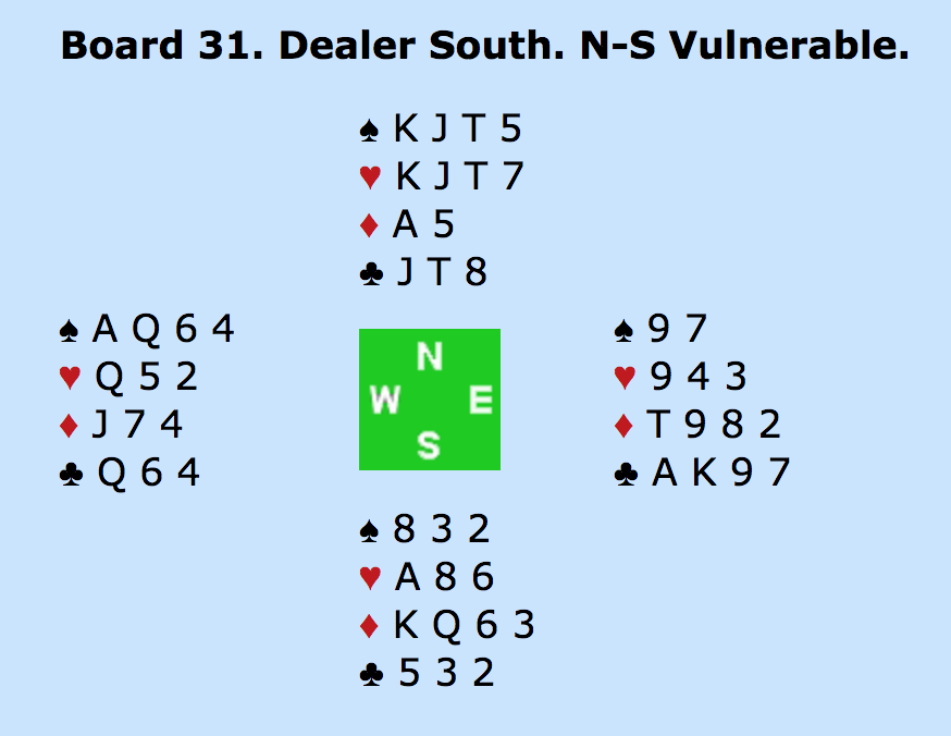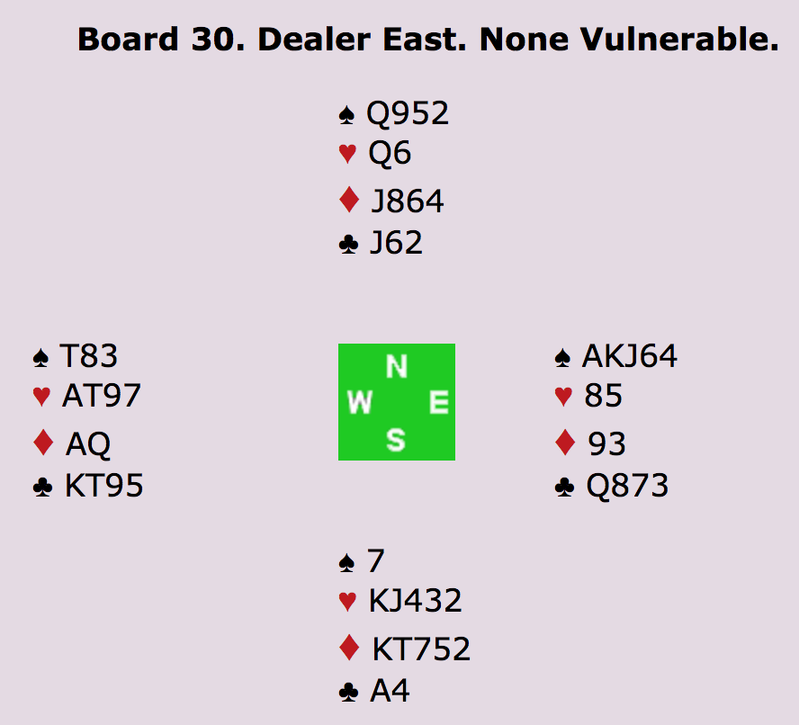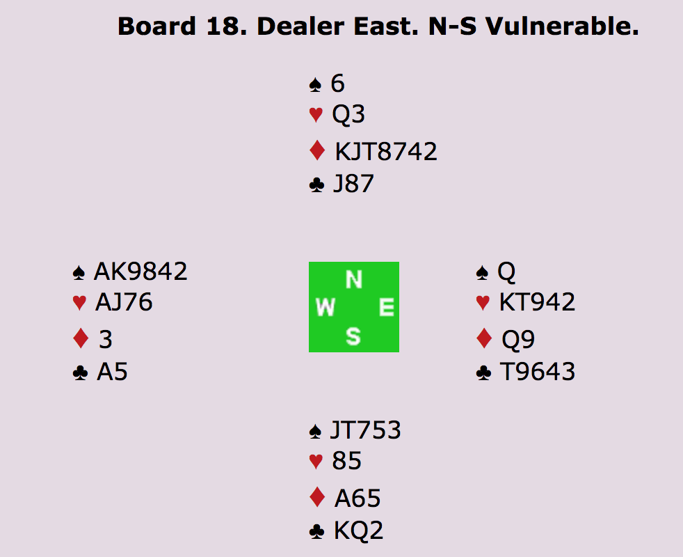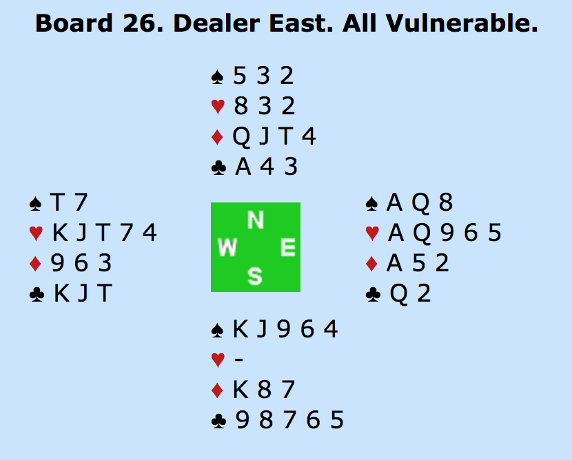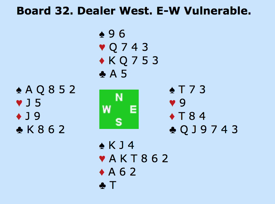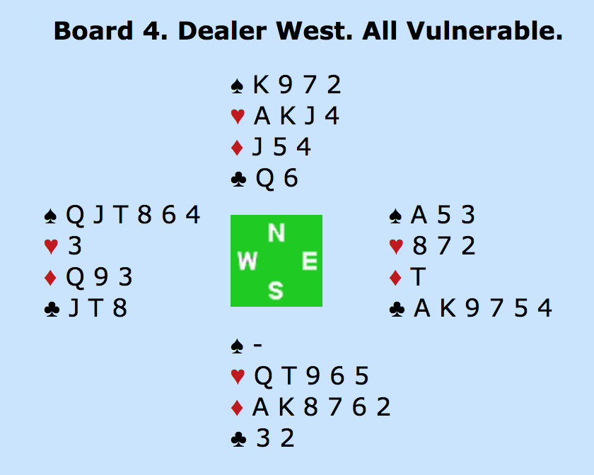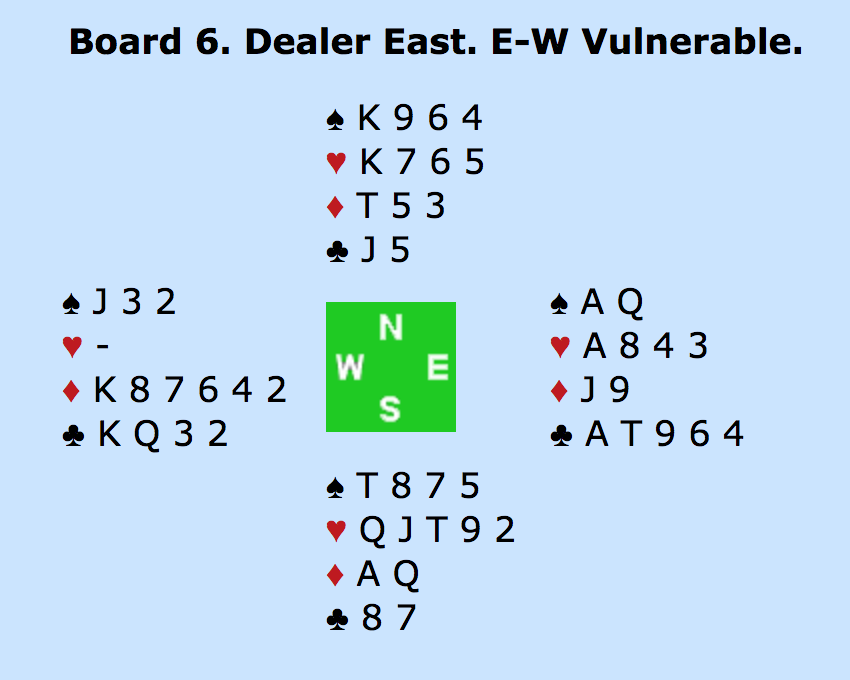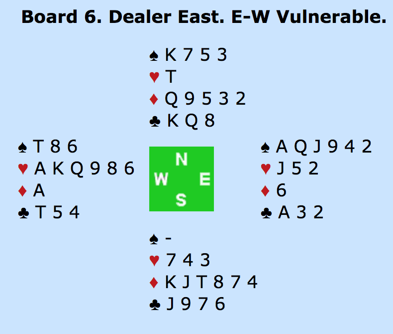 ØST: PAS - SYD: - 5HJ (TO ESSER UDEN TRUMF DAME) - VEST: PAS - NORD: 6HJERTER!? MED ÉT ES (HJERTER KONGE) OVER FOR MAKKERS TO - ALLE PAS.