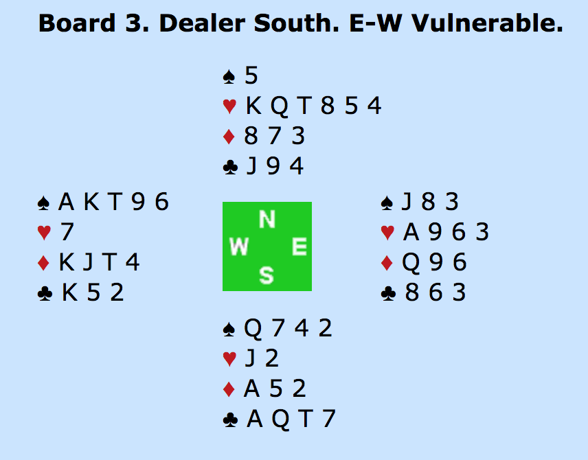 ØST: PAS - SYD: (STOP) 3HJERTER (SPÆRRENDE OVER FOR DEN SVAGE) - VEST: 4RUDER - NORD: 4UT (1430 med hjerter som trumf).