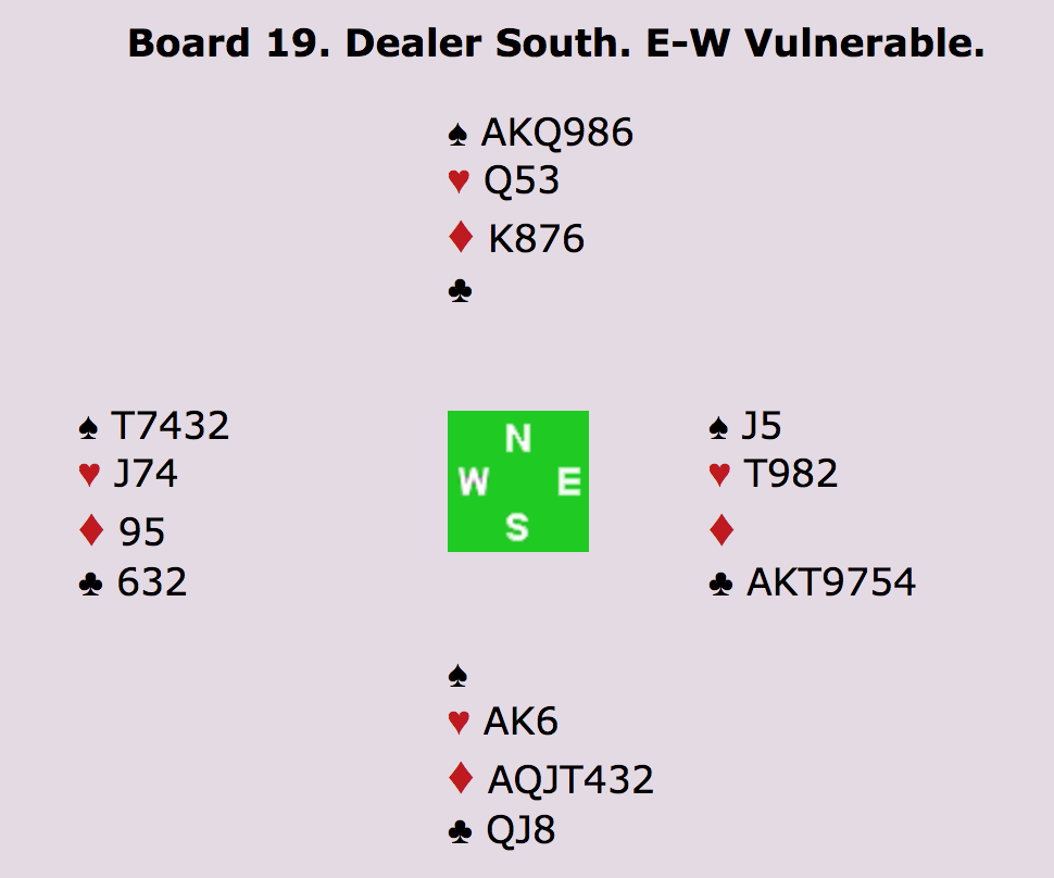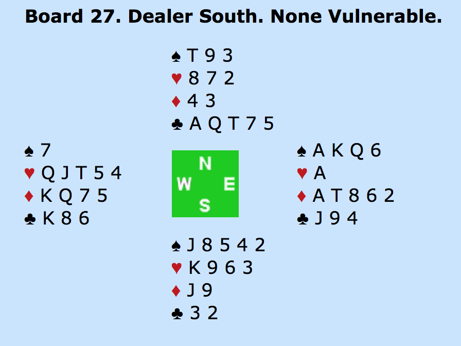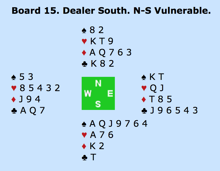 1UT (N) - 2RU (S) (Transfer til HJ) - 3RU (jeg er sleminterresseret med HJ og RU) - 4KL (god hånd med HJ som trumf) 4SP (trelde keycard-spørgemelding efter seks keycards, i.e. fire esser trumf konge og ruder konge) - DBL (V) - 5KL (N) (hvilket efter doblingen er fjerde trin og viser kontrol i spar og tre keycards ud af de seks) - Pas (Ø) - 6HJ (S) - Alle Pas.