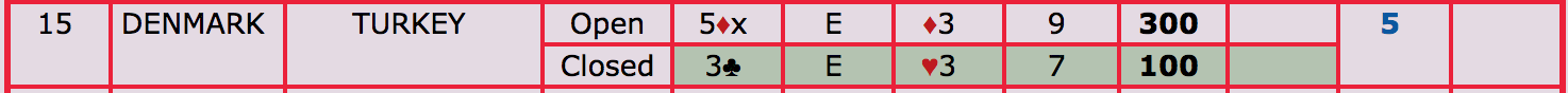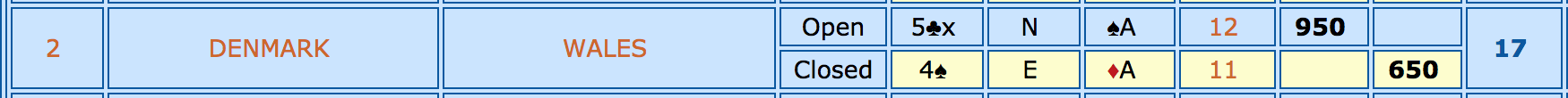 Dagens første kamp startede ikke så godt, da Østrig hurtigt bragte sig foran med 28 imp. Heldigvis holdt drengene (Dennis-Lars-Jonas-Lauge) fast i kortene og fire gode spil til sidst medførte, at vi kunne trække os ud af opgøret med en sejr på 3 imp. Dagens anden kamp bød heldigvis på mange gode danske spil og førte til en sejr på 35-4. Disse 2 kampe medfører at vi nu ligger nr 12 med ca 9 kp op til kvalifikationspladsen.