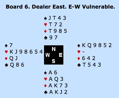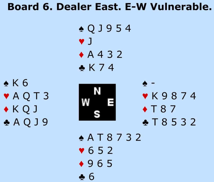I dette spil sendte nordmanden, der sad vest nordmændene i slem overfor en minimumsåbning. 6kl blev dermed kontrakten. Uden at se modspillernes kort ville det ligne en hård omgang, men som man kan se på spildiagrammet, kan det nærmest ikke gå galt, når klørene sidder 3-2, ruder es sidder i plads, spar konge sidder i plads, og hjerter dame sidder 3. i syd. Chancerne for at 6kl vandt var ikke ligeså små, som det vi plejer at kalde en typisk norgeslem, men alligevel ikke de bedste. Brun - Bune stod kontrolleret i 5kl ved det andet bord. 11 IMPs til Norge.