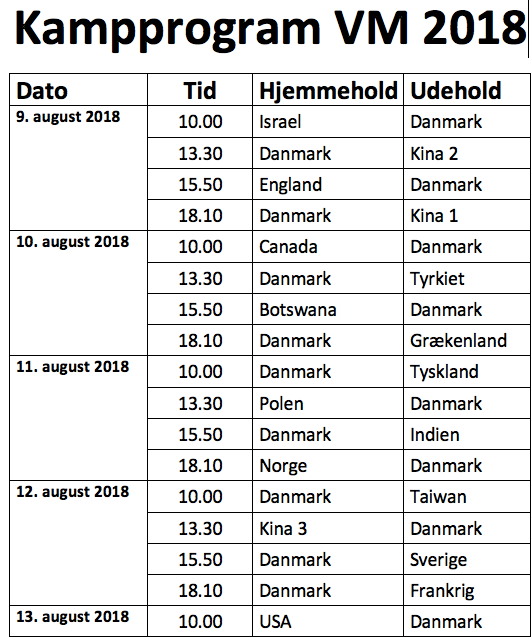 Kampprogrammet er noget ujævnt. Vi har 4 hårde modstandere på dag 1 og mod slut, mens alle de formodede blødere modstandere ligger i midten af programmet. Vi er klar over, at vi skal respektere alle modstandere og at ingen kampe er afgjort på forhånd. Vi går ind til alle kampe for at vinde. Målet er at være med mandag, den 13. august, når kvartfinalerne afvikles.