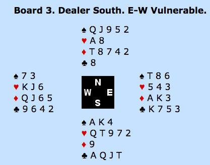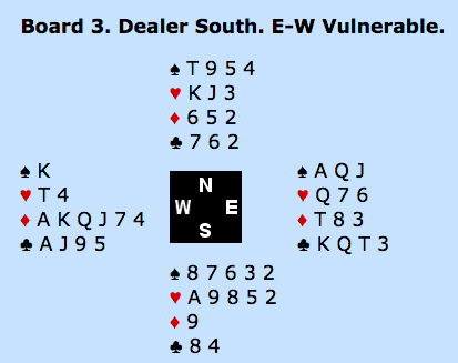 Her åbnede syd 3ru på trods af 4-farven i spar. Det gav pote, da det ikke gav makker muligheden for at melde hjerter. Aron og Daniel endte hermed med at komme i 4hj og blive doblet. 3 doblede zonebeter senere kunne de notere -800.