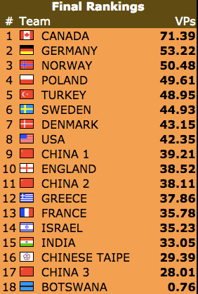 Der mangler en kamp af kvalifikation. Danmark skal møde USA, der ligger nr. 1. Kina 1 skal møde Taiwan, så dem skal danskerne ikke regne med at ende over. Israelerne skal dog møde Kina 3, og man må dermed håbe, at man på en enkelt kamp kan skaffe 13,75 KP mere end Israelerne samtidig med, at man holder tyskerne bag sig. Tyskerne skal møde Tyrkiet, der ligger nr. 15.