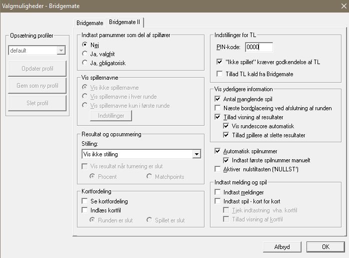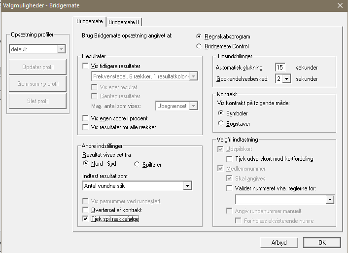 Start BridgeMate Control Software (BCS), vælg Værktøj → Valgmuligheder → BridgeMate for at foretage generel konfiguration som beskrevet nedenfor, og luk derefter programmet.