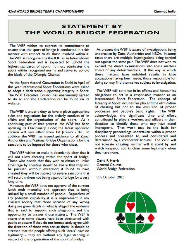 Så har WBF kommet med en udtalelse omkring sager om snyderi og håndteringen af dem. Denne udtalelse fra fra WBF's juridiske rådgiver David Harris, blev bragt i bulletinen ved det nyligt afsluttede VM i Chennai.