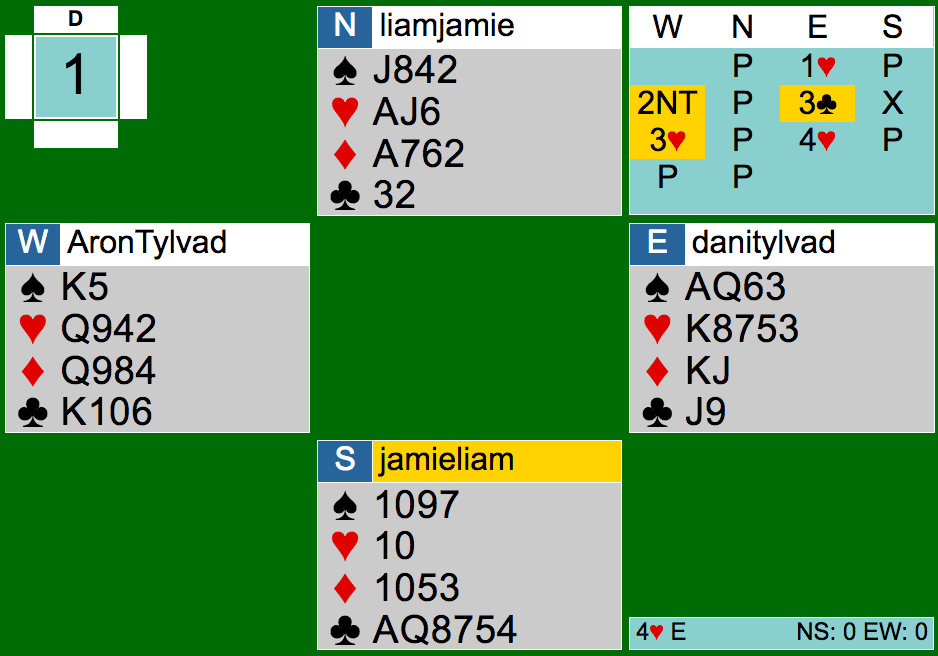 Her viste Aron med 2NT og 3hj en inviterende hånd med 4-kortsstøtte, hvorefter Daniel tog imod invitationen og meldte 4hj.