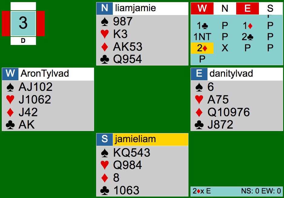 Tylvadbrødrene var dog ikke færdige. I spil 3 ville Daniel stå af i 2ru. Her meldte han 2kl, som er xy-NT, og nord valgte at doble den kunstige 2ru-melding, da han ønskede ruder ud. Den dobling blev passet ud. Man kan diskutere, om syd skal melde 2sp, og syd endte også med at have 580 gode grunde til at skulle have meldt.