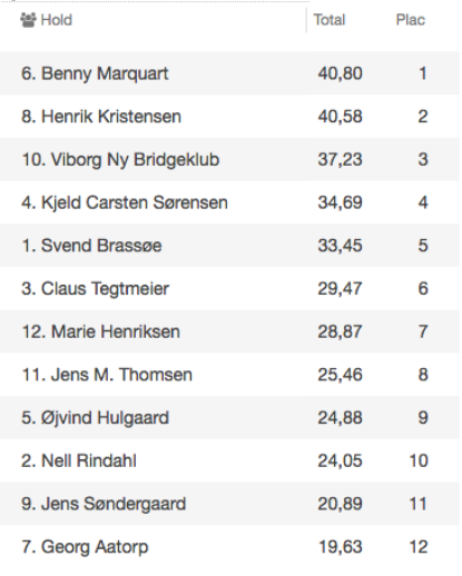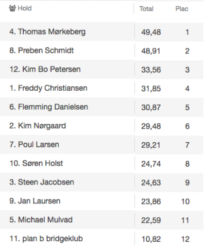 Det var et overblik over situation i divisionerne efter 3 runders spil. Søger man mere info kan man finde dette på http://bridge.dk/0009/