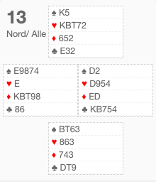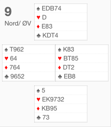 Efter doblingen var Ø-V fanget, og det lukrerede de senere danmarksmestre på. 2kl blev straffet både med doblingen, men også med fint modspil, der sendte den ned i 3 stik, der gav 1400 til drengene.