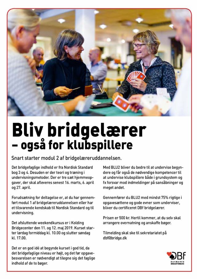 Sidste frist for tilmelding til BLU2 er nu på lørdag d. 16. februar, så vil du med, så skriv til dbf@bridge.dk og tilmeld dig.