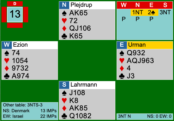 Ved det ene bord åbnede israerleren, der sad øst, 1NT. Efter stayman og 2hj svar, blev der sagt 2NT invit. Efter en længere pause valgt man at passe. Det var svært at skifte til ruder fra syd, og spilfører endte efter klørudspil med at tage 9 stik.