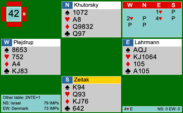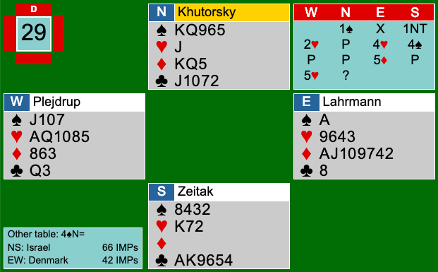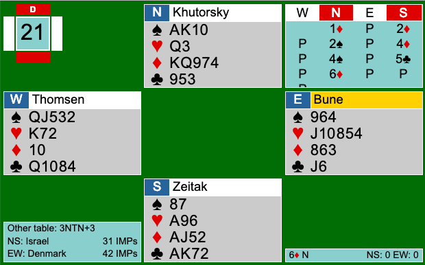 Danmark vandt første sektion med 9 IMPs. Israelerne valgte dog at sidde på samme måde i anden halvleg, hvilket set efterfølgende var et meget godt valg. I anden sektion var Israel bedst. Bl.a. i dette spil tjente de mange IMPs, da de meldte en hård 6ru.