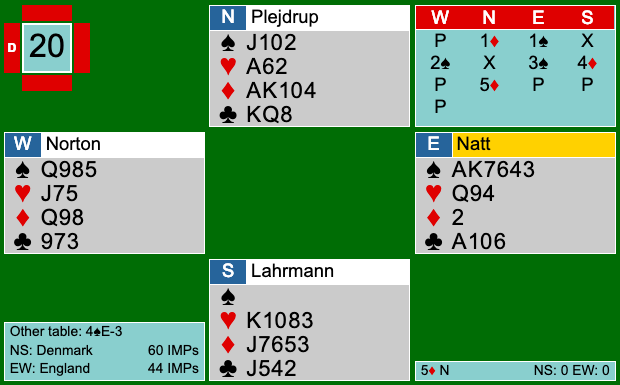 Christian ville ikke melde ruder, da han vidste, at han aldrig ville finde ud af, om makker havde 4-farve i hjerter. Derfor startede han med at doble og ville vise sin hånd som 18+, hvis makker meldte klør. Det fungerede godt. Oven på 1NT, der var transfer til klør, kunne Andreas nemlig 2 hjerter. Christian meldte nu 4 hjerter, og syd meldte 4 spar. Rigtigt besluttede Christian ikke at spille imod og meldte 5 ruder, der måtte være en ægte farve, da den ikke kunne være for udspillet. Pas fra syd blev forklaret som krav, og nord meldte derfor 5sp ovenpå 5hj. I 5sp skulle man gætte sparene for at vinde. Da Christian havde vist mange point og mange røde kort, er det ikke langt væk at spille ham for spar es blank. Hvis han havde renonce i klør, ville kontrakten gå ned alligevel. Heldigvis gættede spilfører ikke sparene og gik derfor én ned. 12 IMPs til Danmark, da Emil og Søren havde stået fint i 4sp ved det andet bord.