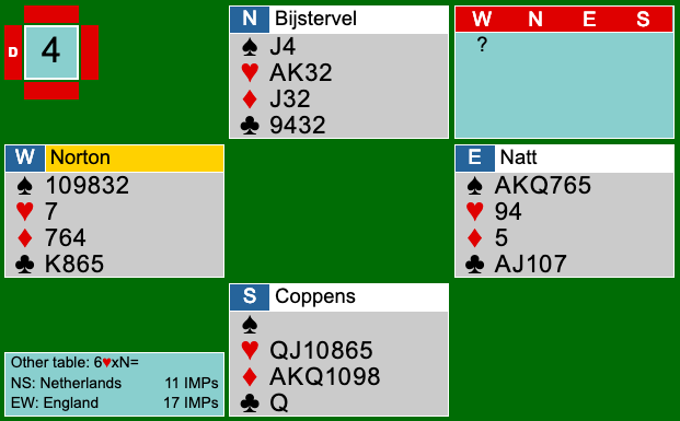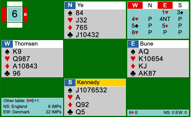 På det andet bord havde Bune kun vist hjerter. Derfor blev der knebet i spar efter hjerter konge var slået væk. Øst-Vest havde dermed 7 stik i modspillet, hvilket resulterede i 14 IMPs til Danmark.