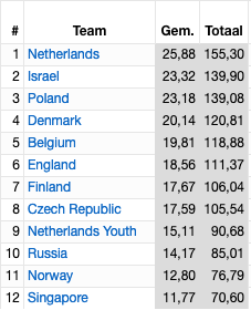 Den øverste del af tabellen ligner meget stillingen fra indledende runde. Top 4 fra Danmarks indledende runde endte altså også som top 4 i mellemrunden. Det resultat betød, at Holland fik lov først at vælge kvartfinalemodstander. De valgte England, da de havde tabt stort til Finland tidligere på dagen, hvilket var deres eneste nederlag på de tre første dage.