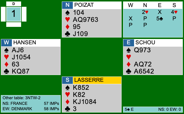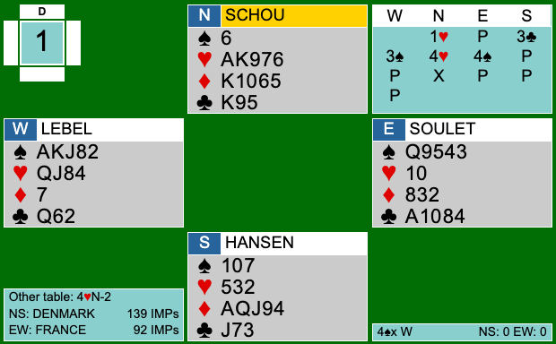 Lasserre meldte hårdt 4hj, så Hansen måtte doble, hvorefter Schou kunne sende dem i den rette kontrakt; 5kl. Knud-Åge Boesgaard meldte dog mere vist, da han nøjedes med 3hj og derefter lod modstanderne lave fejlen. Franskmanden meldte 3NT på 3hj, og den gik pas rundt.