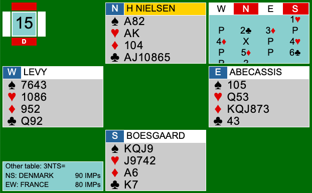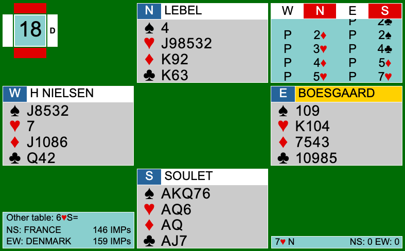 Her meldte Jørgen Hansen og Steen Schou 6hj ved det andet bord. Franskmændene tog den et skridt videre og kom til 7hj, der vinder, hvis man gætter hjerterne. Det er sådan en type slem de norske juniorer har tendens til at melde og vinde mod danskere. Heldigvis var det Frankrig vi mødte, så spilfører spillede fint lille hjerter til damen og måtte senere afgive et hjerterstik. Det svingede 30 IMPs!!! Og gav Danmark 17 IMPs i stedet for minus 13.