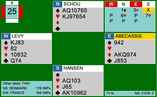 Da Hansen kunne negativ-doble, blev Schou dog glad. Med 4-kortstøtte i hjerter skal der ikke meget til før 7hj vinder. Han meldte dog 6hj, men den kunne Hansen heldigvis hæve. Hansen kunne også se på den besynderlige melding, at Schou måtte have en unormal hånd. 7hj var i hvert fald rigtig, men franskmændene ved siden af gav sig ikke og meldte den også selv.