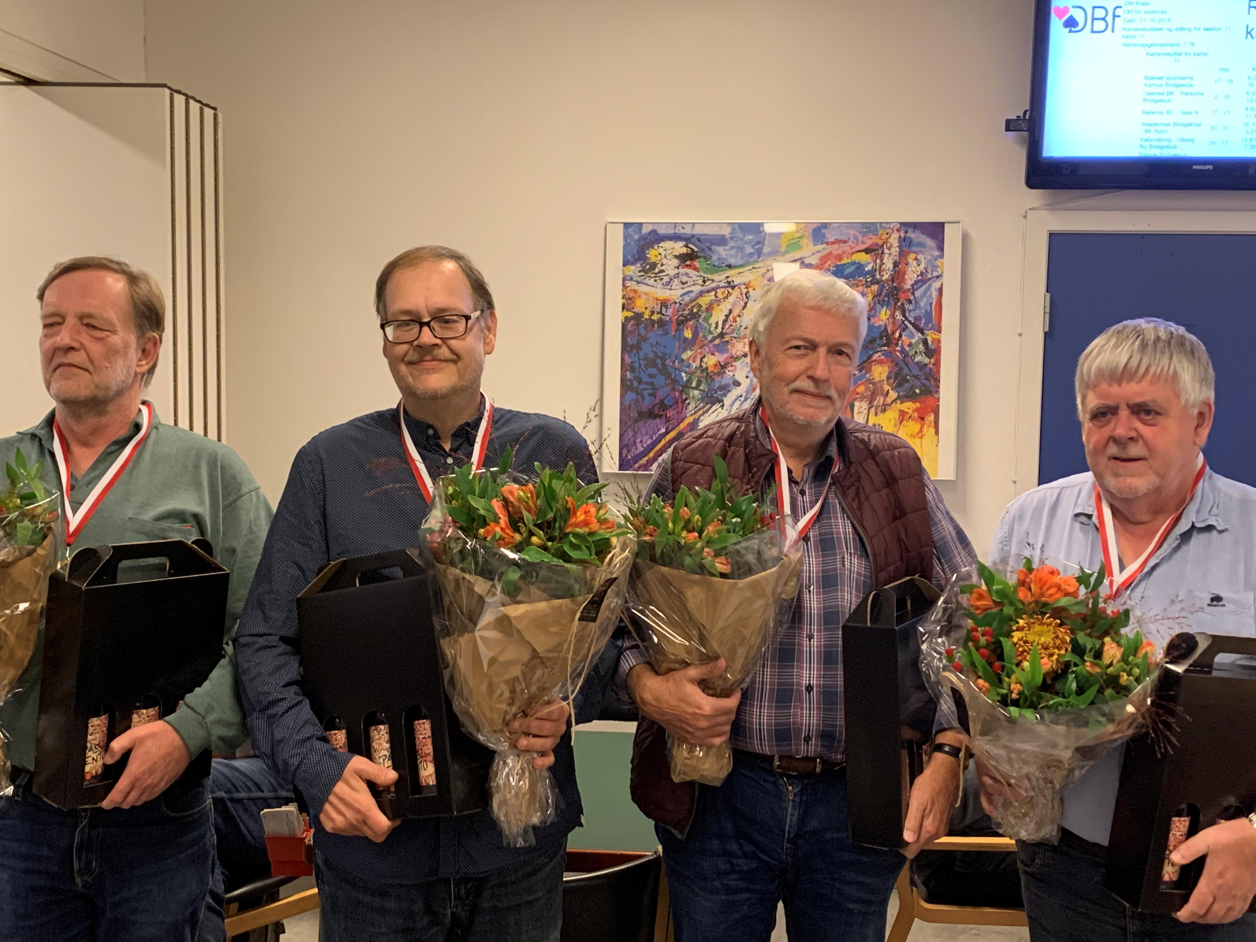 Bronzemedaljerne gik til de forsvarende mestre fra Aarhus Bridgeklub: Mads Krøjgaard, Jan Pedersen, Nils Mønsted og Morten Stege.