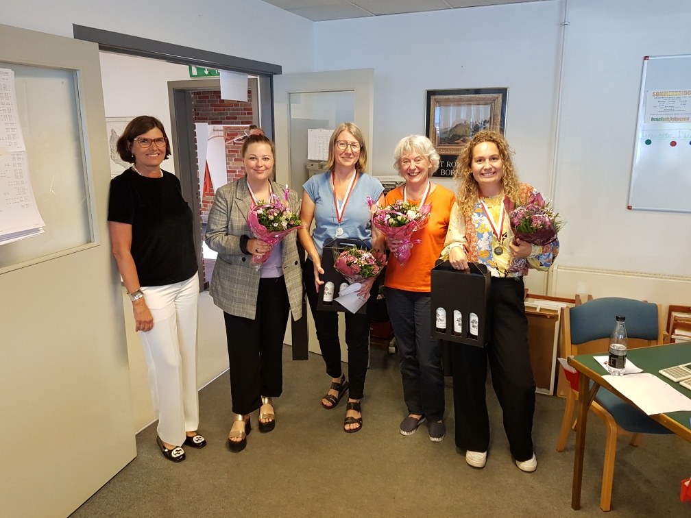 Vinderne fik både blomster, vin og medaljer. Flankeret af direktør i DBf, Charlotte Fuglsang, er fire af danmarksmestrene: Signe Buus Thomsen, Leise Hemberg, Dorte Cilleborg og Johanne Bilde Kofoed.