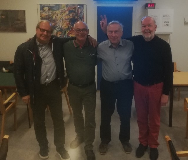 Steen Schou (til højre) laver V-tegnet efter sejren i Aarhus. Holdkammeraterne er Peter Schaltz, Jørgen Hansen og Knud-Aage Boesgaard. H.C. Nielsen var også med på holdet, men spillede ikke sidste kamp.