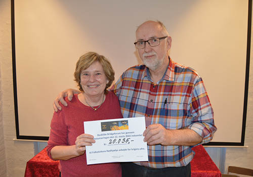 Hos formand Visti Christensen i Roskilde har klubben oplevet en fantastisk opbakning til projektet fra medlemmerne. 72 bridgespillere deltog i turneringen og efter præmieoverrækkelse lørdag eftermiddag kunne klubben skrive en check på ikke mindre end 20.035 kr. Beløbet indeholder spillerbidrag, lotto og salg. Søndag kom der fortsat donationer ind hos Roskilde Bridge.