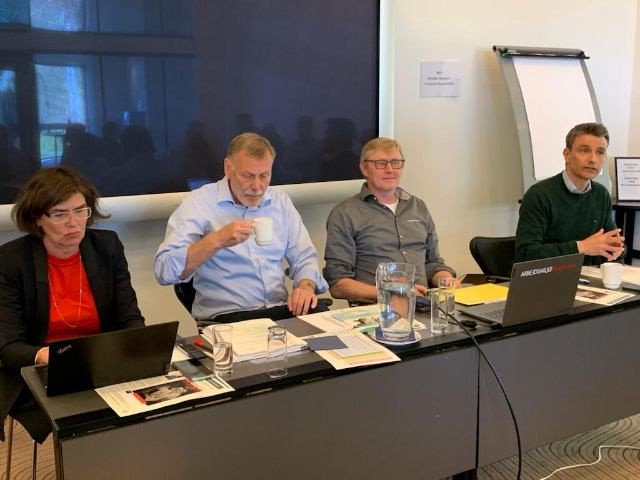 Et kig ud over forsamlingen Dybt koncentrerede Charlotte Fuglsang (direktør), Kurt Als (næstformand), Nis Rasmussen (formand) og Mikkel Nøhr (dirigent)