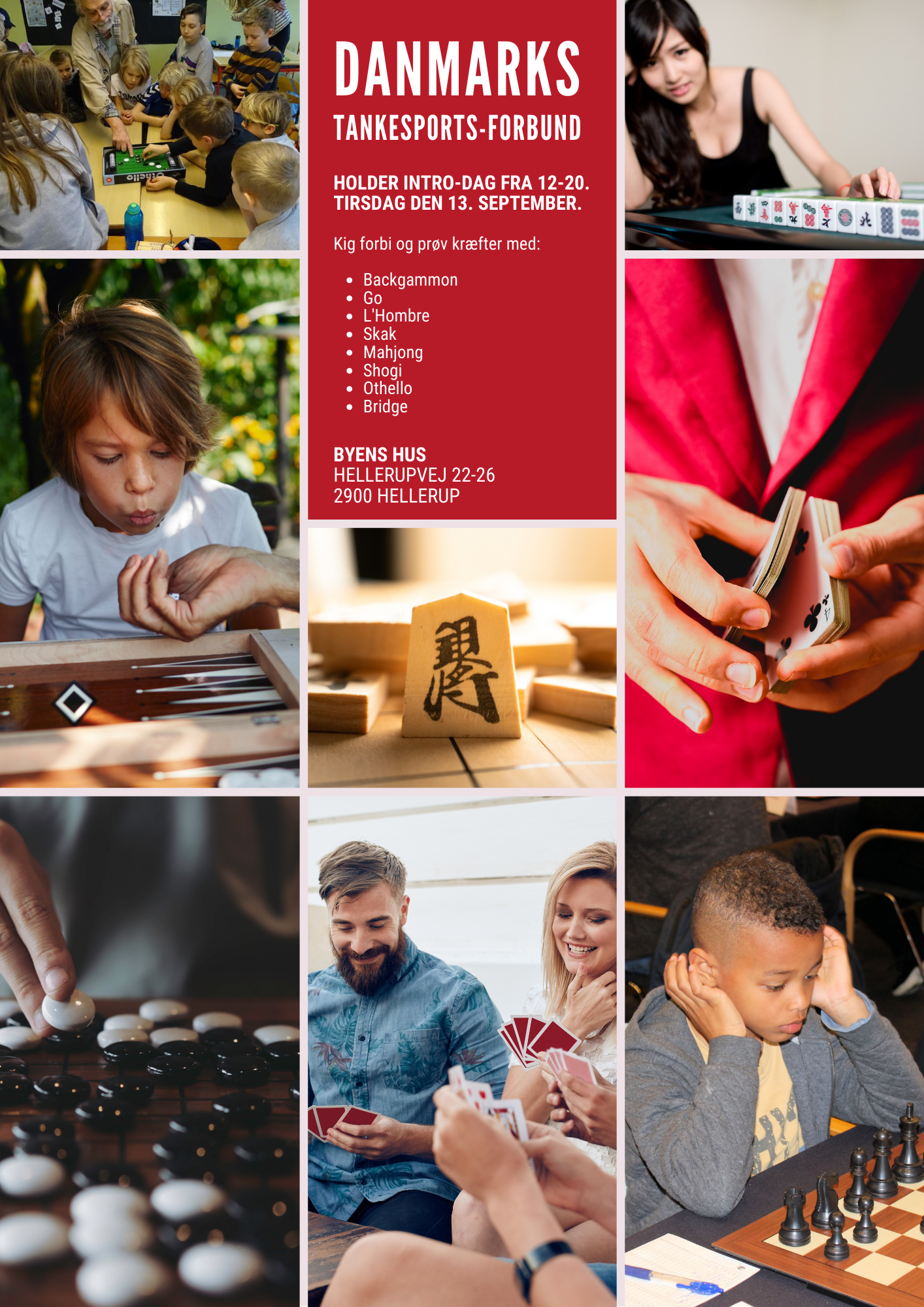Danmarks Tankesports-Forbund afholder en intro-dag, hvor alle har lejlighed til at opleve de mange forskellige tankesportsgrene. Nogle af spillene vil måske være godt kendt for de fleste, mens andre byder på overraskelser. Kom forbi og stift bekendtskab med skak, backgammon, l'hombre, mahjong, shogi, othello, go og selvfølgelig bridge.