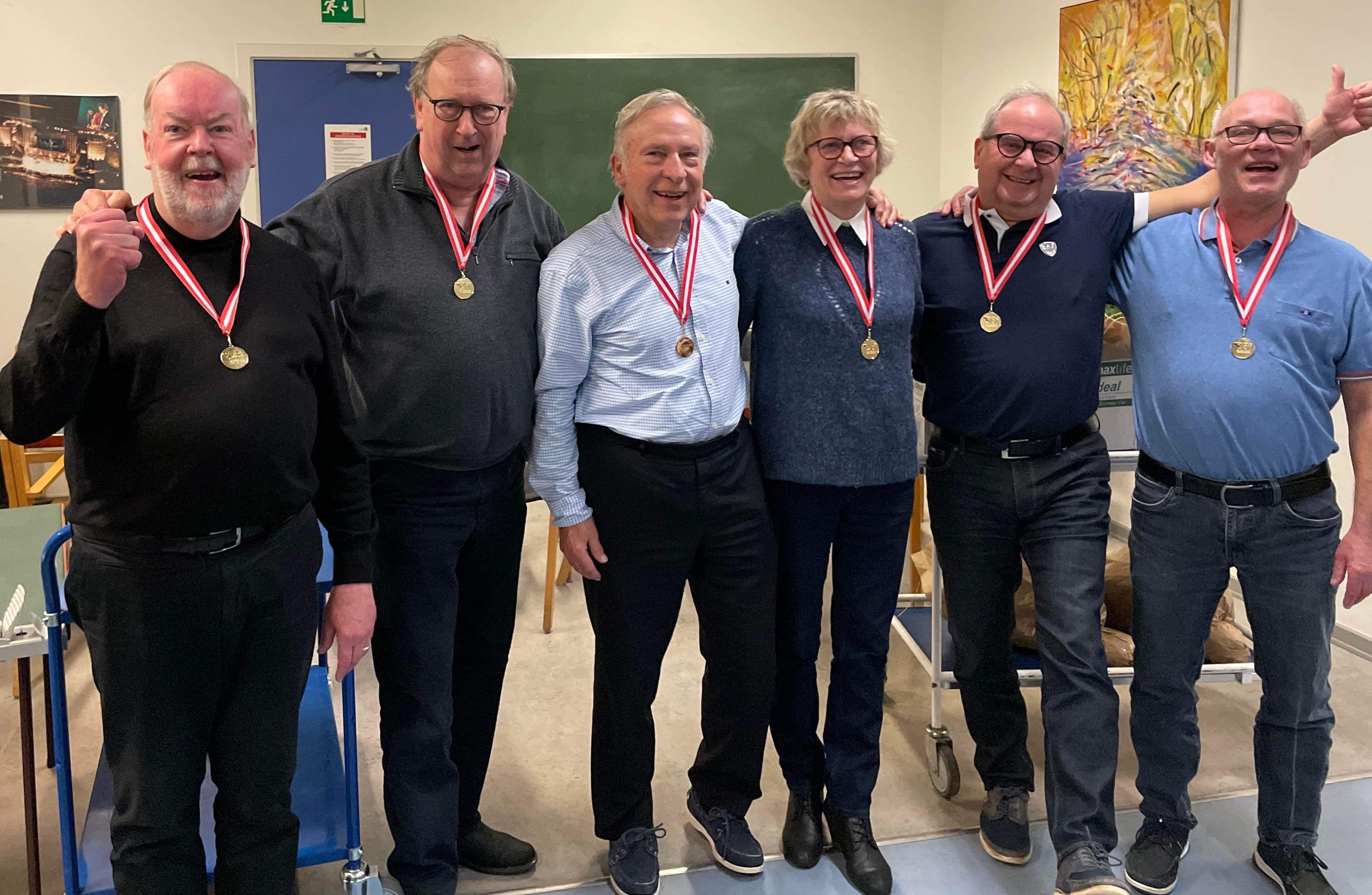 Vinderne kunne juble efter sejren. Fra venstre: Steen Schou, H.C. Nielsen, Knud-Aage Boesgaard, Dorthe Schaltz, Peter Schaltz og Jørgen Hansen (foto: Nis Ramussen):